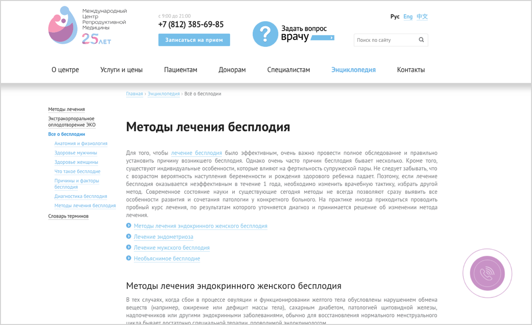 Выяснили, что предыдущий подрядчик пользовался «черными» методами продвижения. Как следствие, сайт угодил под санкции Яндекса и лишился трафика по жизненно важному для клиники запросу «эко». Переработали контент главной, структуру меню, метатеги, на всех страницах убрали переспам ключевых слов и поправили форматирование. Без переписки с поддержкой Яндекса тоже не обошлось.