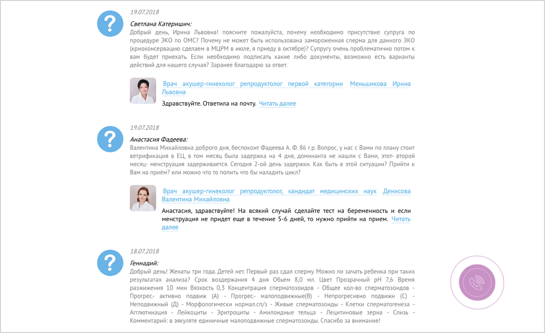 Дополнительный трафик по информационным запросам дает раздел «Вопросы и ответы». Пользователь задает вопрос врачу с помощью формы обратной связи, и ответ публикуется на отдельной странице, когда врач отвечает. Раздел структурирован по специализации врачей, и разводящие страницы тоже собирают трафик, но уже по среднечастотным запросам. Подобный контент не привязан к определённому региону и может хорошо ранжироваться по России. Это, в среднем, 14% всего поискового трафика.