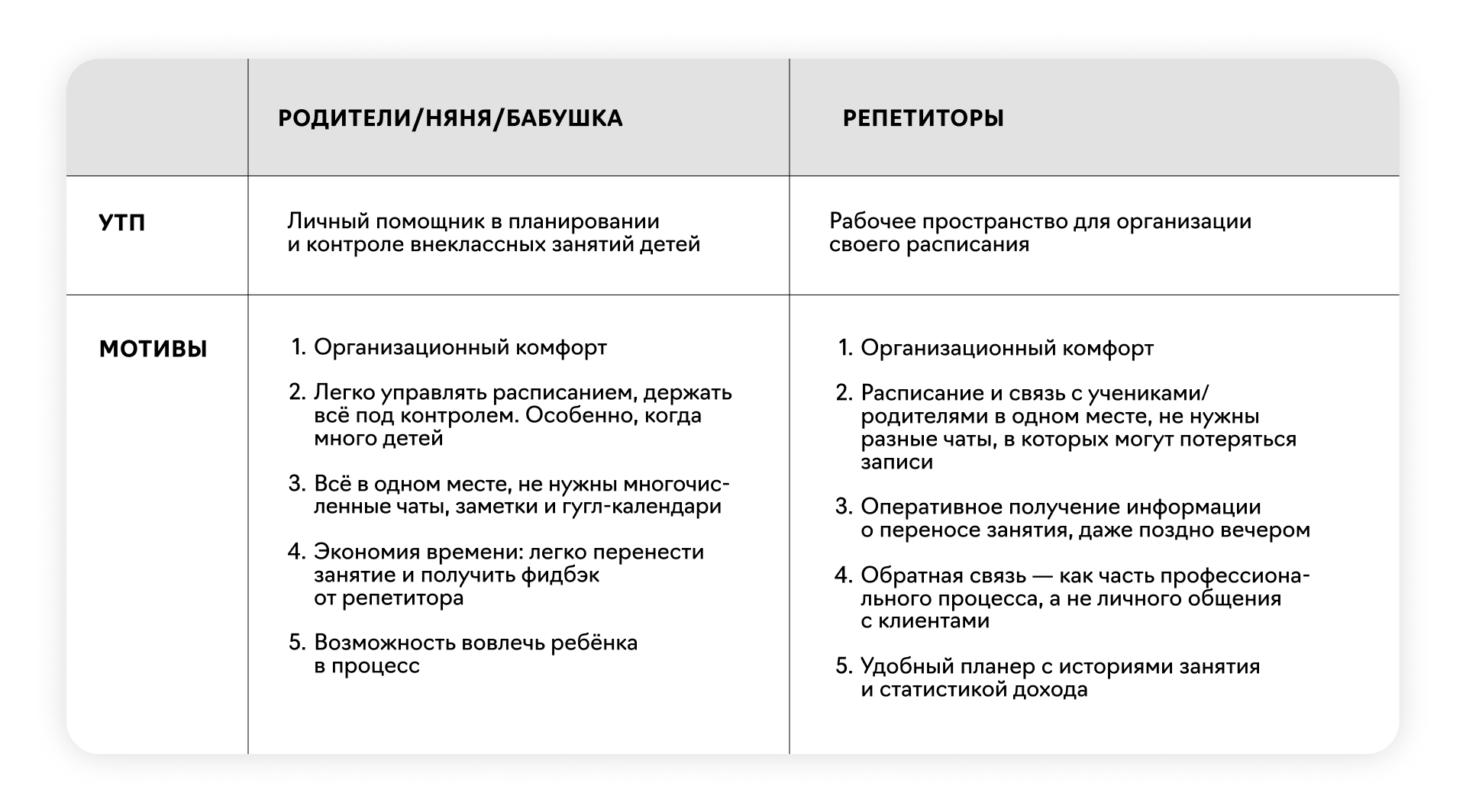 Изначально приложение разрабатывалось для родителей, чтобы помочь им с организацией своего дня, упростить коммуникацию с репетитором и иметь возможность отслеживать успехи ребёнка, поэтому клиент выделял эту аудиторию как приоритетную.