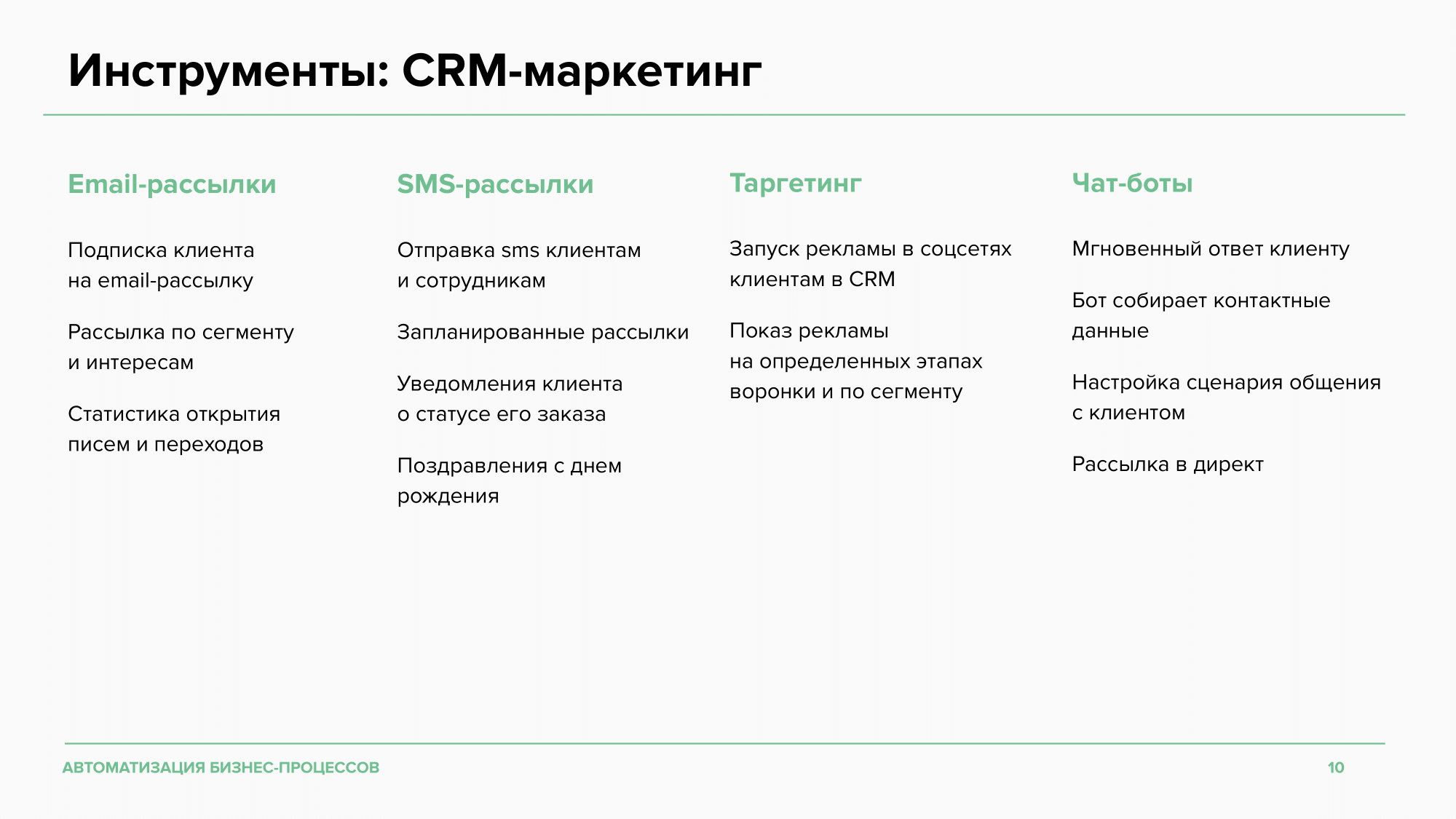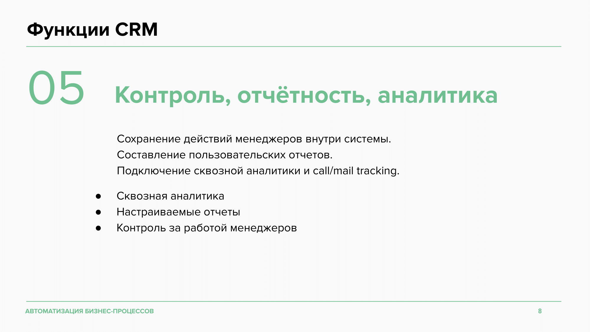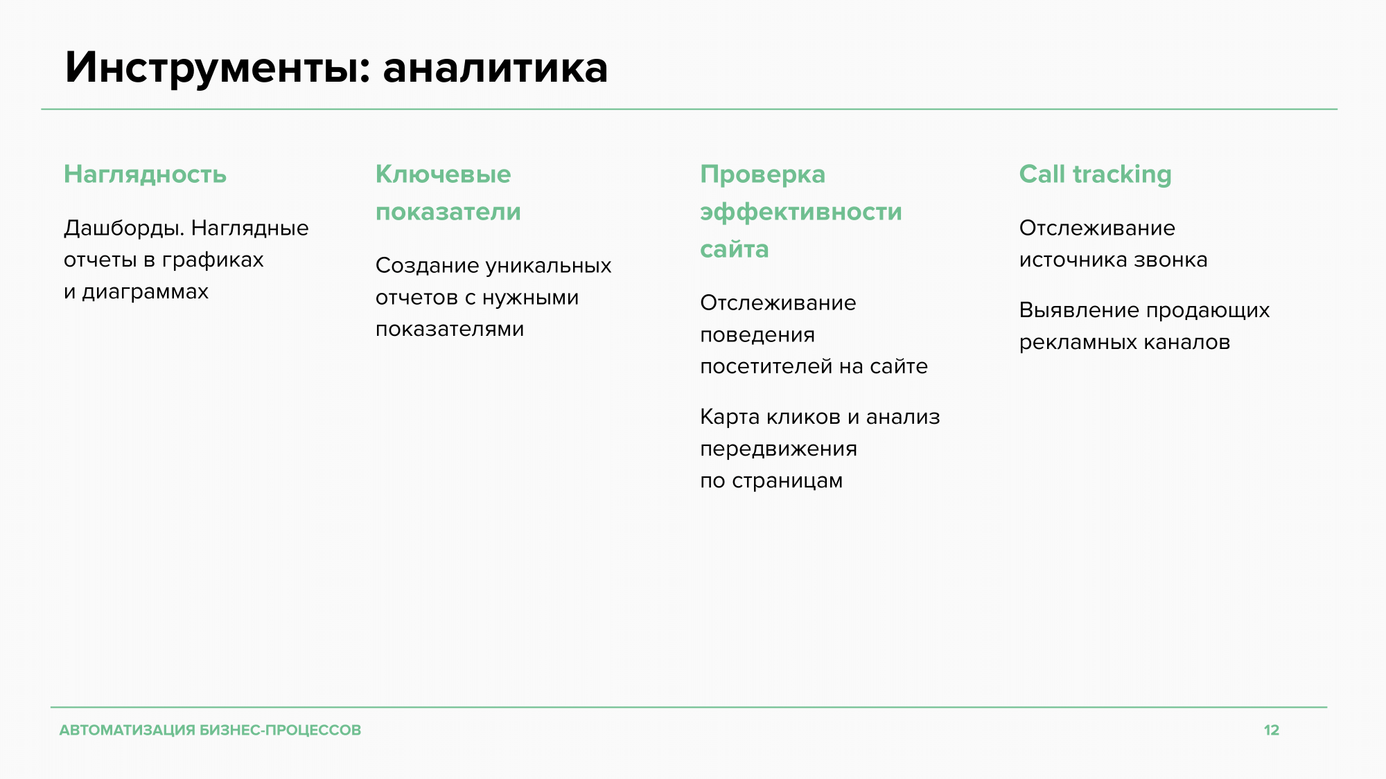 ΠΠΎΡΡΡΠΏΠ½Ρ ΠΌΠ½ΠΎΠ³ΠΈΠ΅ ΠΏΠΎΠΊΠ°Π·Π°ΡΠ΅Π»ΠΈ Π΄Π»Ρ Π°Π½Π°Π»ΠΈΠ·Π°: ΠΊΠΎΠ½Π²Π΅ΡΡΠΈΡ ΠΏΡΠΎΠ΄Π°ΠΆ, Π²ΡΠΏΠΎΠ»Π½Π΅Π½ΠΈΠ΅ KPI, LTV, ΡΡΠ°ΡΠΈΠΊ Π»ΠΈΠ΄ΠΎΠ² ΠΏΠΎΒ ΠΊΠ°Π½Π°Π»Π°ΠΌ ΠΈΒ Π΄ΡΡΠ³ΠΈΠ΅. ΠΡΠΎΠΌΠ΅ Π±Π°Π·ΠΎΠ²ΠΎΠ³ΠΎ ΡΡΠ½ΠΊΡΠΈΠΎΠ½Π°Π»Π° Π°Π½Π°Π»ΠΈΡΠΈΠΊΠΈ, ΠΌΠΎΠΆΠ½ΠΎ ΠΏΠΎΠ΄ΠΊΠ»ΡΡΠΈΡΡ ΡΠΏΠ΅ΡΠΈΠ°Π»ΡΠ½ΡΠ΅ ΡΠ΅ΡΠ²ΠΈΡΡ: