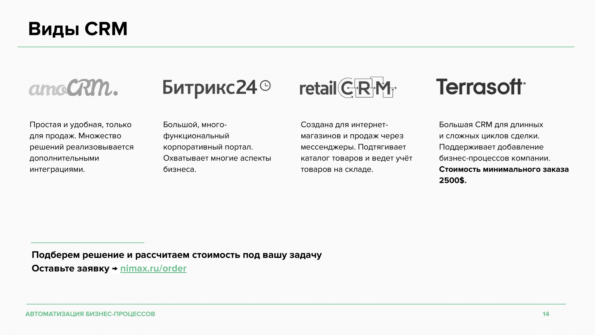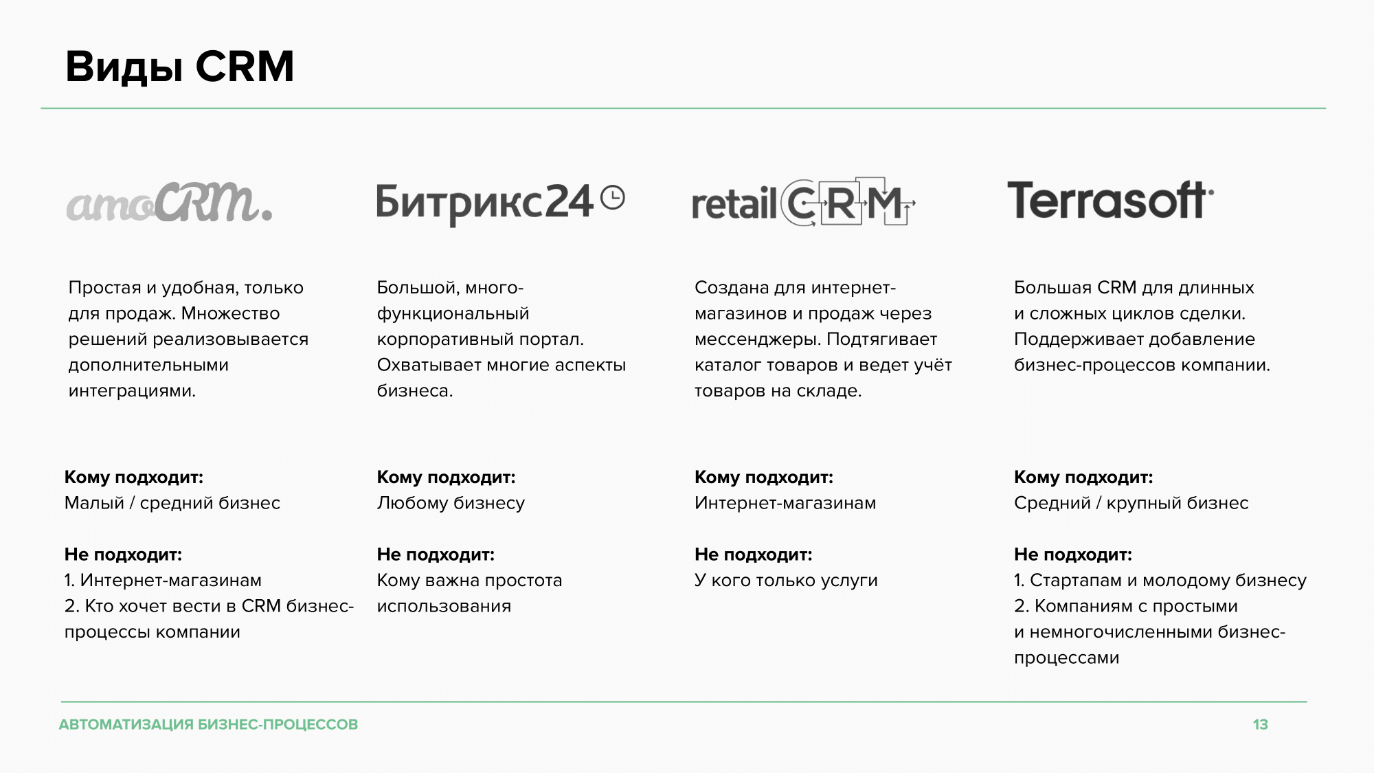 Π‘ΡΡΠ΅ΡΡΠ²ΡΠ΅Ρ ΠΌΠ½ΠΎΠΆΠ΅ΡΡΠ²ΠΎ Π²ΠΈΠ΄ΠΎΠ² CRM: ΡΠΈΡΠ΅ΠΉΠ»-ΠΏΠ»Π°ΡΡΠΎΡΠΌΡ, ΠΊΠΎΡΠΏΠΎΡΠ°ΡΠΈΠ²Π½ΡΠ΅ ΠΏΠΎΡΡΠ°Π»Ρ, ΡΠΈΡΡΠ΅ΠΌΡ Π΄Π»Ρ ΠΎΡΠ΄Π΅Π»ΠΎΠ² ΠΏΡΠΎΠ΄Π°ΠΆ ΠΈΒ Ρ.Π΄. Π£Β ΠΊΠ°ΠΆΠ΄ΠΎΠΉ Π΅ΡΡΡ ΡΠ²ΠΎΠΉ Π½Π°Π±ΠΎΡ ΡΡΠ½ΠΊΡΠΈΠΈ. ΠΠΎΠ³Π΄Π° Π΅Π³ΠΎ Π½Π΅Π΄ΠΎΡΡΠ°ΡΠΎΡΠ½ΠΎ, ΠΌΡΒ ΠΈΠ½ΡΠ΅Π³ΡΠΈΡΡΠ΅ΠΌ ΠΈΠ½ΡΡΡΡΠΌΠ΅Π½ΡΡ, ΠΊΠΎΡΠΎΡΡΠ΅ ΡΠ°ΡΡΠΈΡΡΡ ΡΡΠ½ΠΊΡΠΈΠΎΠ½Π°Π» ΠΏΠΎΠ΄ ΡΠ½ΠΈΠΊΠ°Π»ΡΠ½ΡΠ΅ Π±ΠΈΠ·Π½Π΅Ρ-Π·Π°Π΄Π°ΡΠΈ.