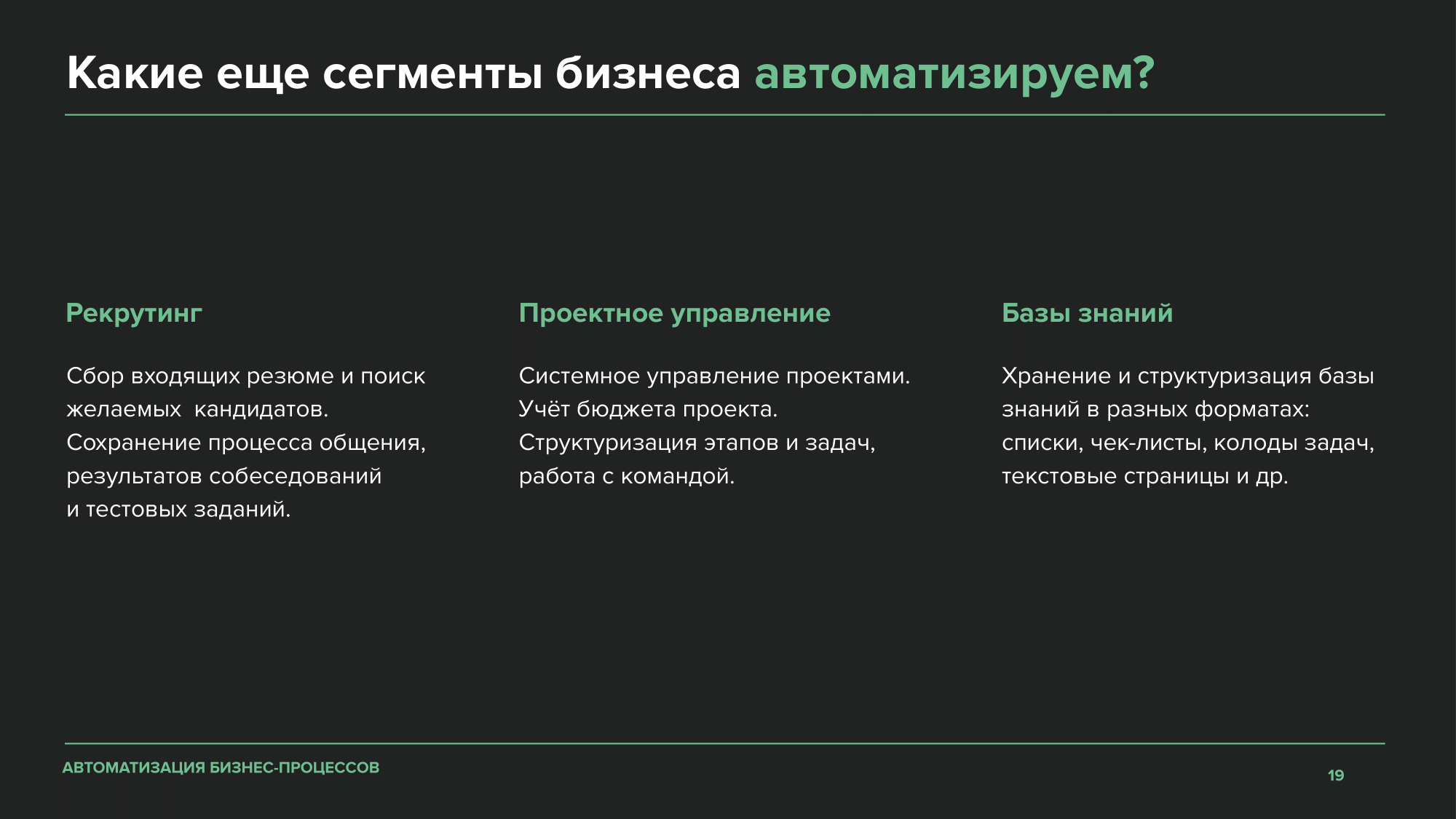 ΠΠΎΠ³Π΄Π° Π½Π΅Β Ρ Π²Π°ΡΠ°Π΅Ρ Π±Π°Π·ΠΎΠ²ΠΎΠ³ΠΎ ΡΡΠ½ΠΊΡΠΈΠΎΠ½Π°Π»Π°, ΠΏΠΎΠ΄ΠΊΠ»ΡΡΠ°Π΅ΠΌ ΡΠ΅ΡΠ²ΠΈΡΡ, Π°ΠΊΡΡΠ°Π»ΡΠ½ΡΠ΅ Π΄Π»Ρ ΡΡΠ΅ΡΡ Π΄Π΅ΡΡΠ΅Π»ΡΠ½ΠΎΡΡΠΈ ΠΊΠΎΠΌΠΏΠ°Π½ΠΈΠΈ: ΡΡΡΡ ΡΠΊΠ»Π°Π΄Π°, ΠΎΡΠ³Π°Π½ΠΈΠ·Π°ΡΠΈΡ Π²ΡΠ΅Π·Π΄ΠΎΠ² ΠΈΒ Π·Π°ΠΌΠ΅ΡΠΎΠ², ΠΈΠ½ΡΠ΅ΡΠ½Π΅Ρ-ΠΌΠ°Π³Π°Π·ΠΈΠ½Ρ, Π΄ΠΎΠΊΡΠΌΠ΅Π½ΡΠΎΠΎΠ±ΠΎΡΠΎΡ.