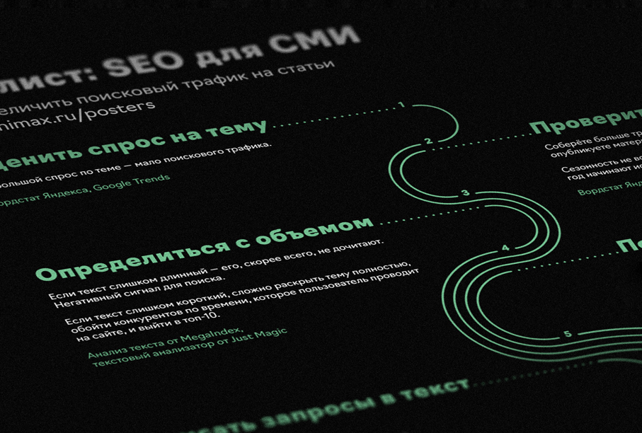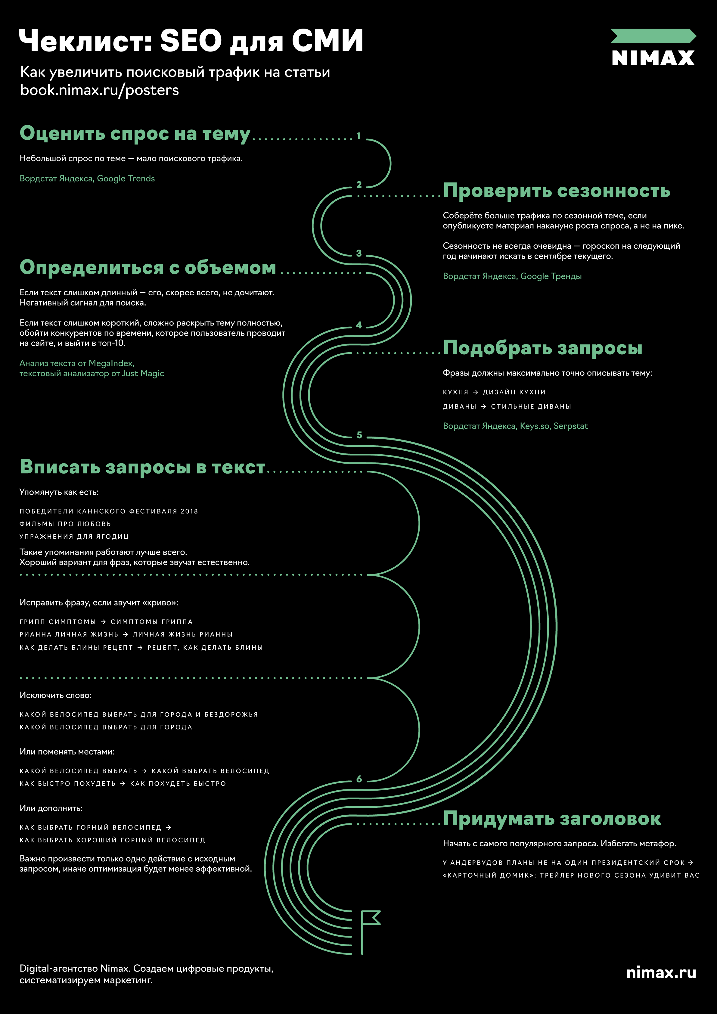 Инфографика состоит из шести шагов, которые помогут получать больше трафика из поиска. Постер пригодится редакторам, копирайтерам, журналистам и всем, кто готовит тексты для медиа. Методика, заложенная в основу плаката, подходит для неновостных материалов по темам, на которые уже есть спрос.