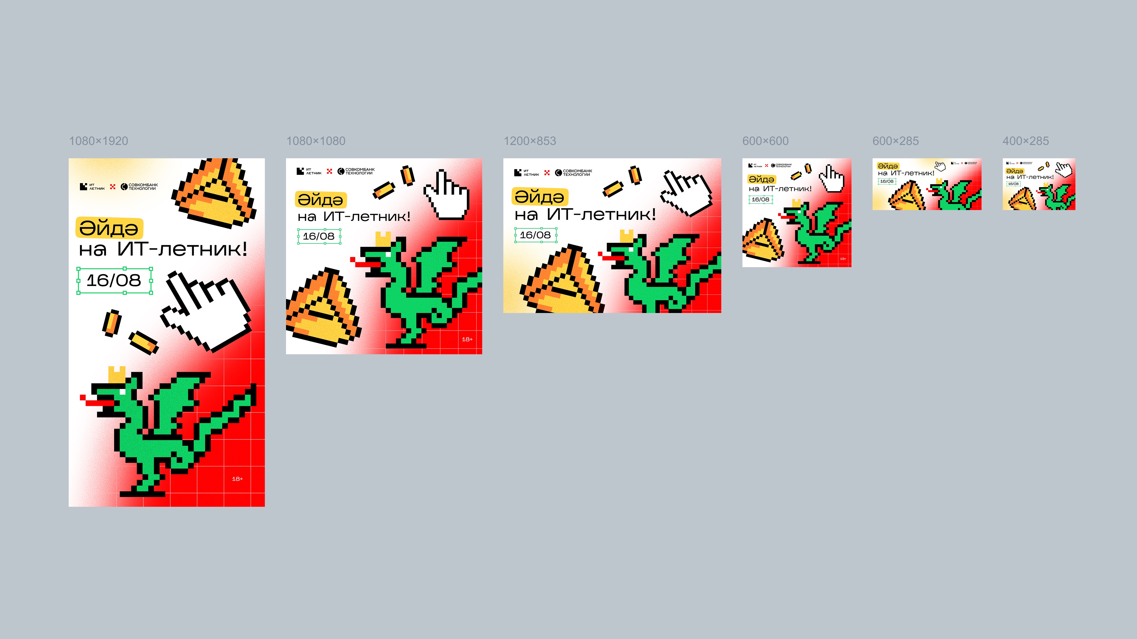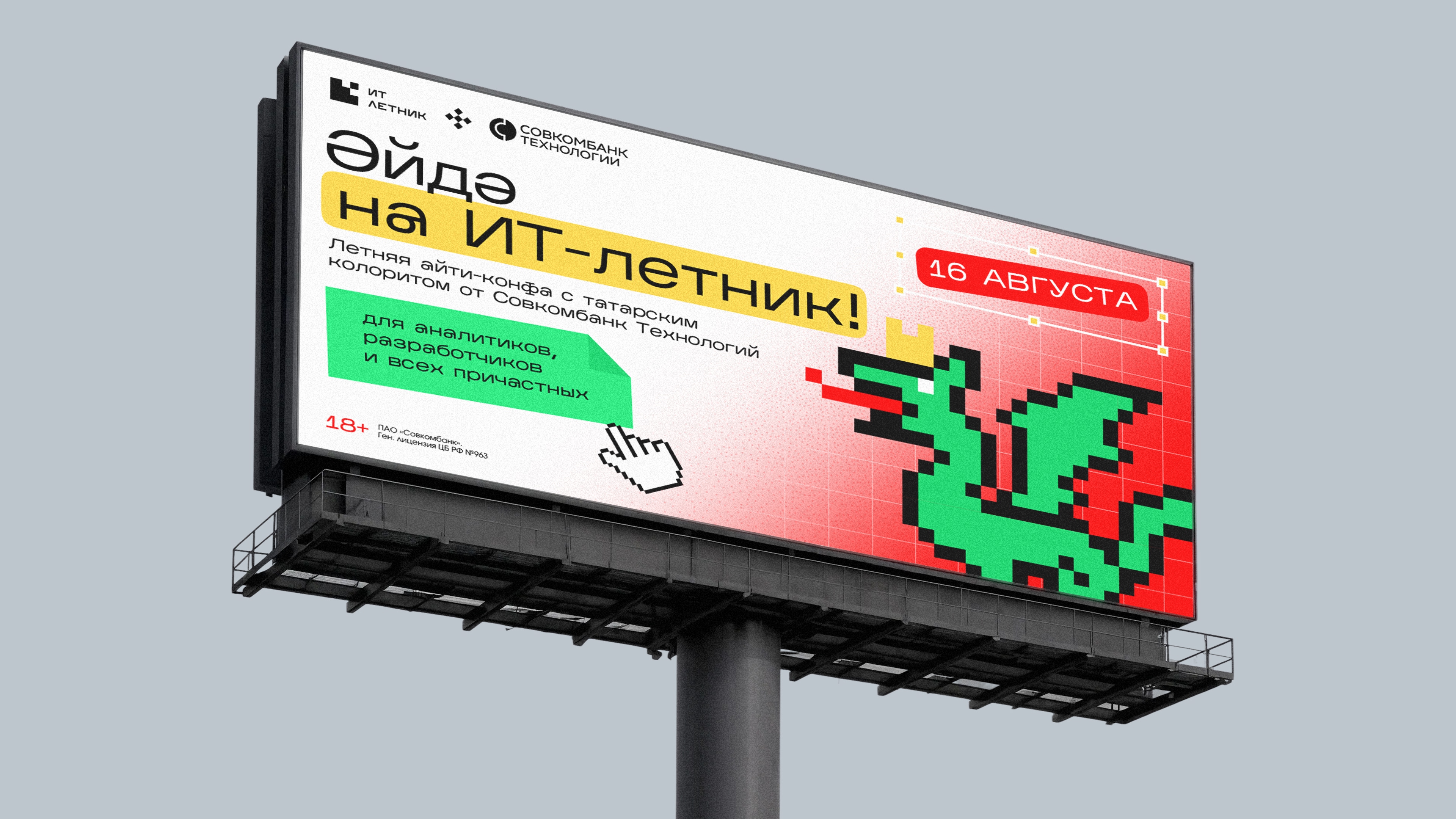 Мы предложили креативную рамку кампании — опереться на идентичность региона и культурный код Казани. Так появилась Big Idea проекта «Код татарский», слоган «Әйдә на ИТ-летник» и общий вектор коммуникации, который команда клиента развила в узнаваемых образах дракона, тюбетейки, чак-чака и эчпочмака в пиксельной стилистике.