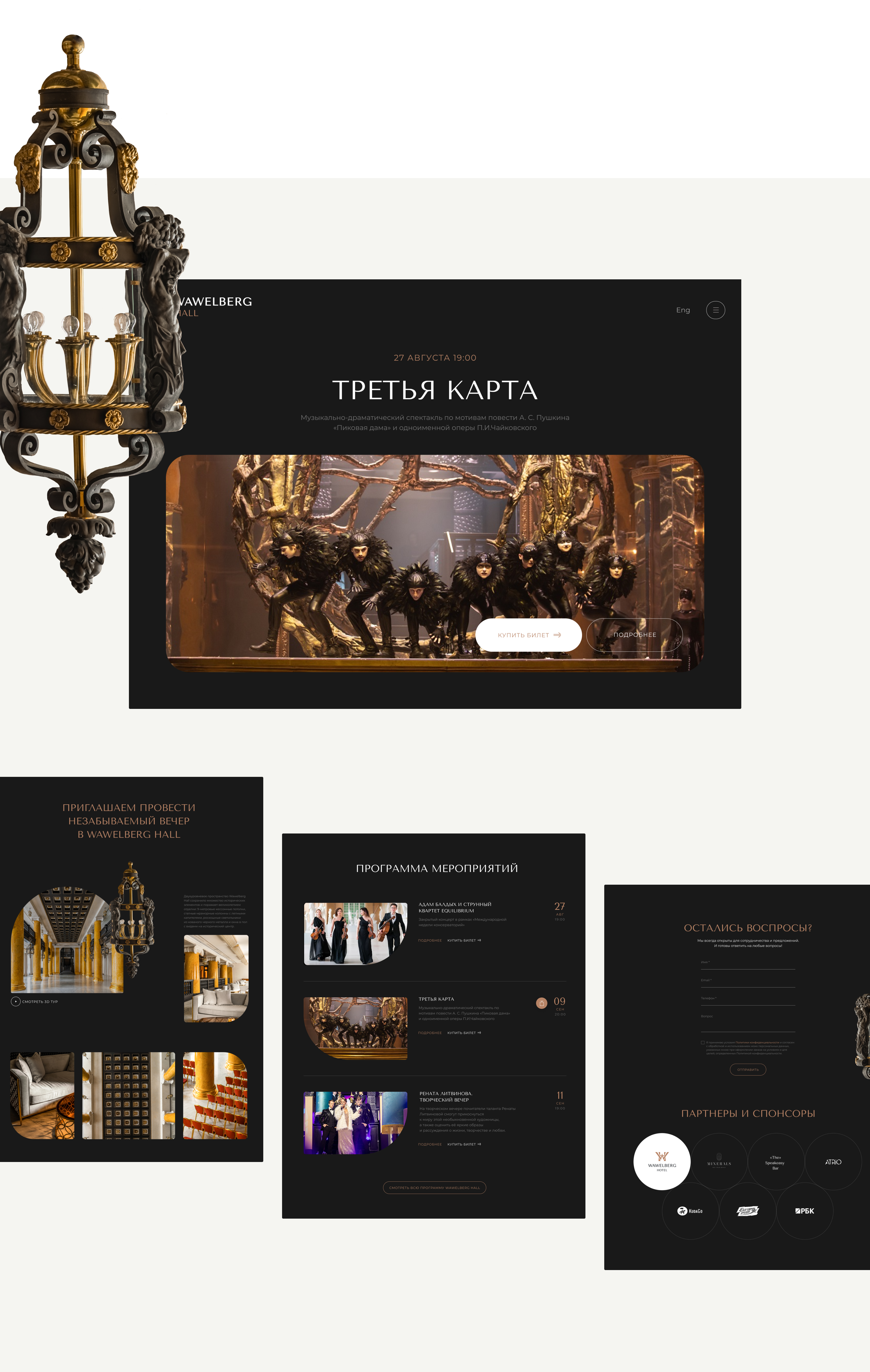 Концепция лендинга холла, роскошного концертного зала в стенах отеля, воздушная и не перегруженная контентом. Акценты сделаны на мероприятия и величественные интерьеры неоренессанса. В пространстве витают исторические люстры, а в меню видим колонны из мрамора цвета охры. Формы фотографий повторяют интерьерные композиции.