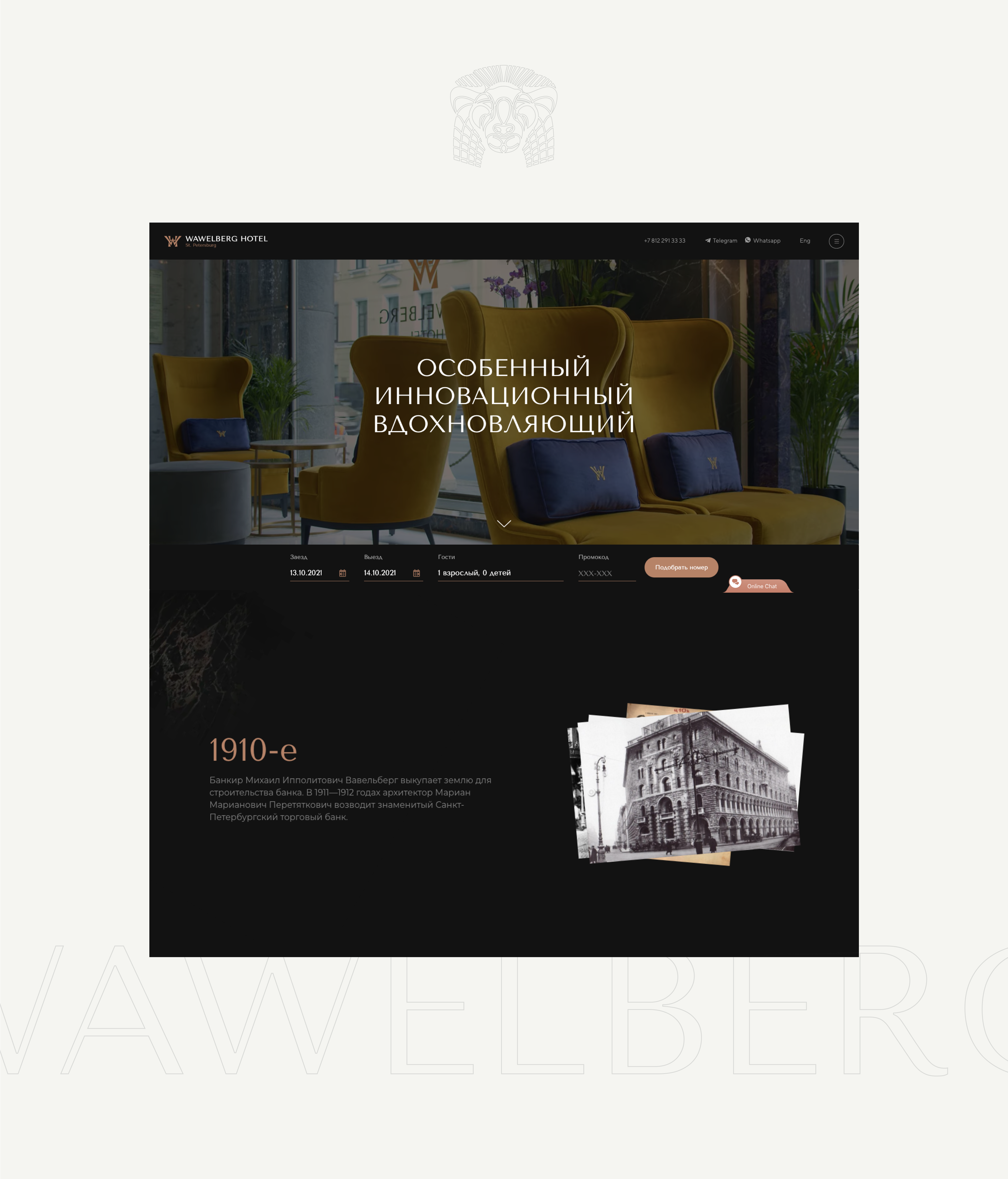 Одна из задач лендинга отеля  показать историчность, премиальность и инновационность места. Фотохроника рассказывает об истории Дома Вавельберга, а появляющаяся из темноты интерьерная отделка отеля из патагонии и мрамора подчеркивает премиальность места.